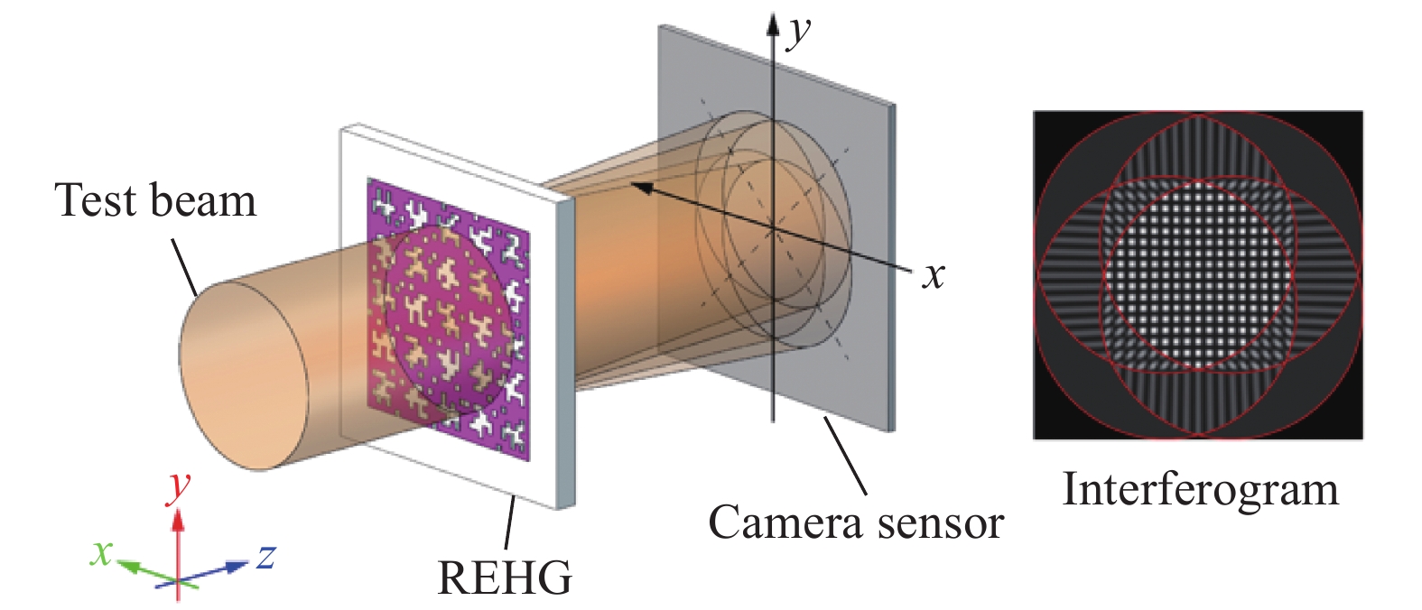 Fig.1.Phase इमेजिंग सिद्धांत चार-लहर पार्श्व शियरिंग हस्तक्षेप के आधार पर यादृच्छिक रूप से कोडित हाइब्रिड ग्रेटिंग (REHG) का उपयोग करके