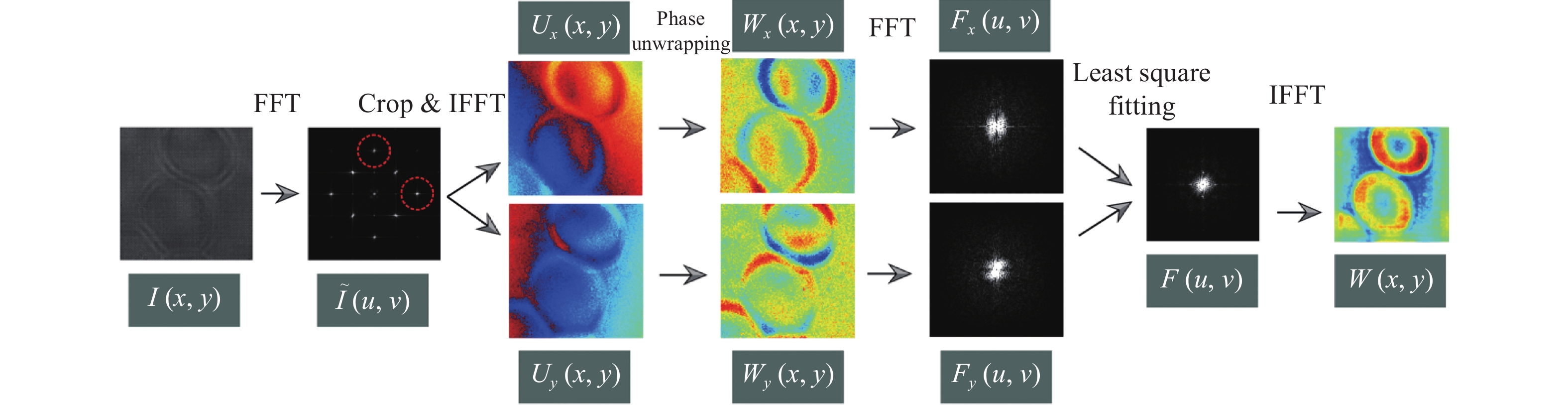 Fig.1.Phase इमेजिंग सिद्धांत चार-लहर पार्श्व शियरिंग हस्तक्षेप के आधार पर यादृच्छिक रूप से कोडित हाइब्रिड ग्रेटिंग (REHG) का उपयोग करके